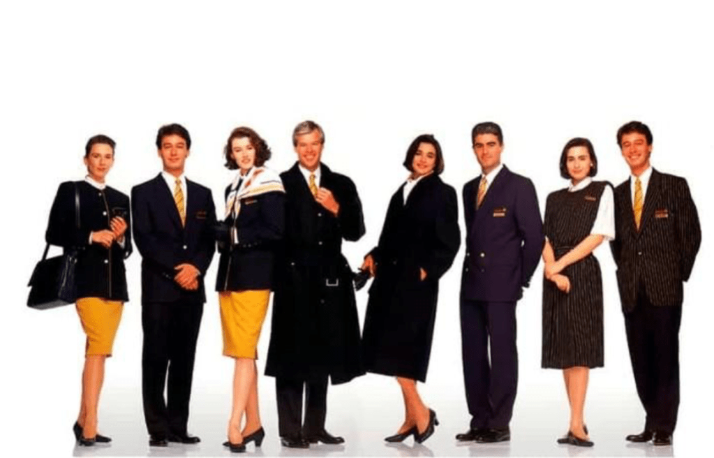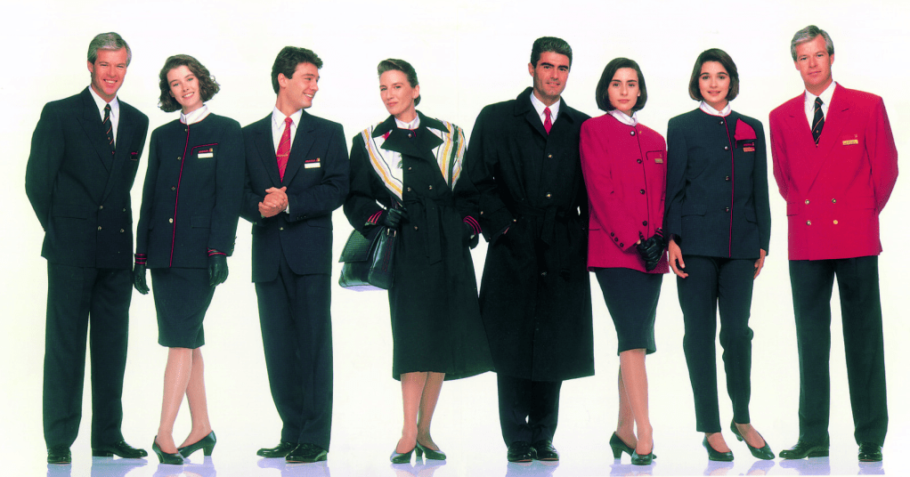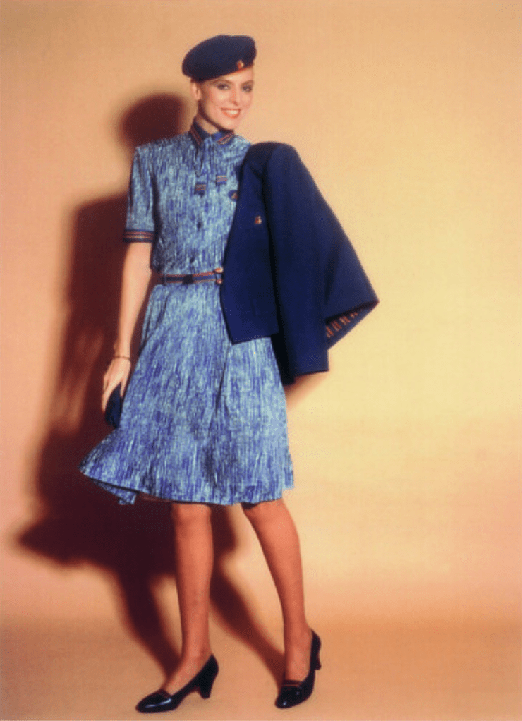 En esta época los uniformes de la compañía eran de inspiración militar y estaban hechos con tela de paracaídas, por lo que eran muy resistentes pero nada cómodos, por la dureza del tejido. En cuanto al diseño, el corte del traje -compuesto por falda y camisa sahariana- era de lo más sencillo y el diseño bastante austero, aunque plagado de bolsillos.