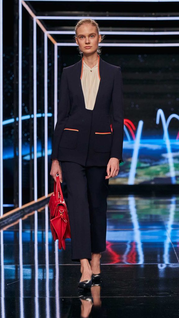 Domínguez conserva el color azul marino que se lució durante tantos años y rompe con el corte de la americana para adornarla con un elegante cuello mao, en la que recae todo el protagonismo. De nuevo el pantalón es una opción para las azafatas que elijan vestirlo en lugar de la falda, con un corte sencillo y una pequeña asimetría en la parte frontal.